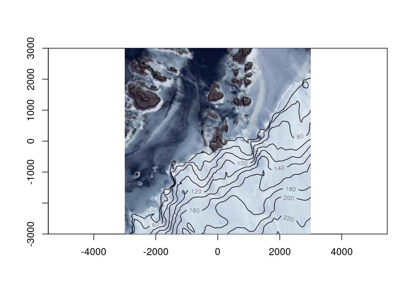 Let’s zoom right in, and this time we’ll use terra so that adding contours is easy, read the REMA v2 2m topography and add it as contours.
